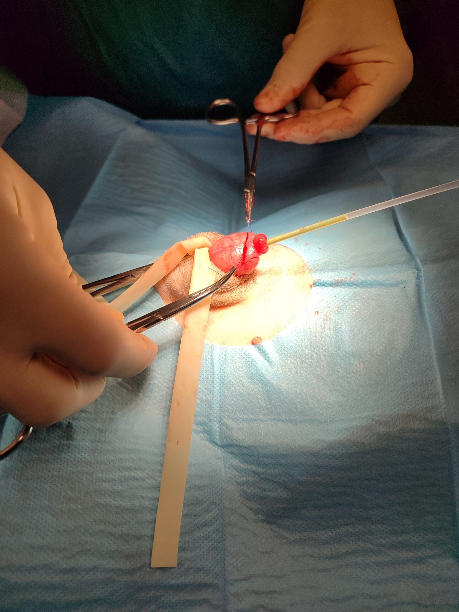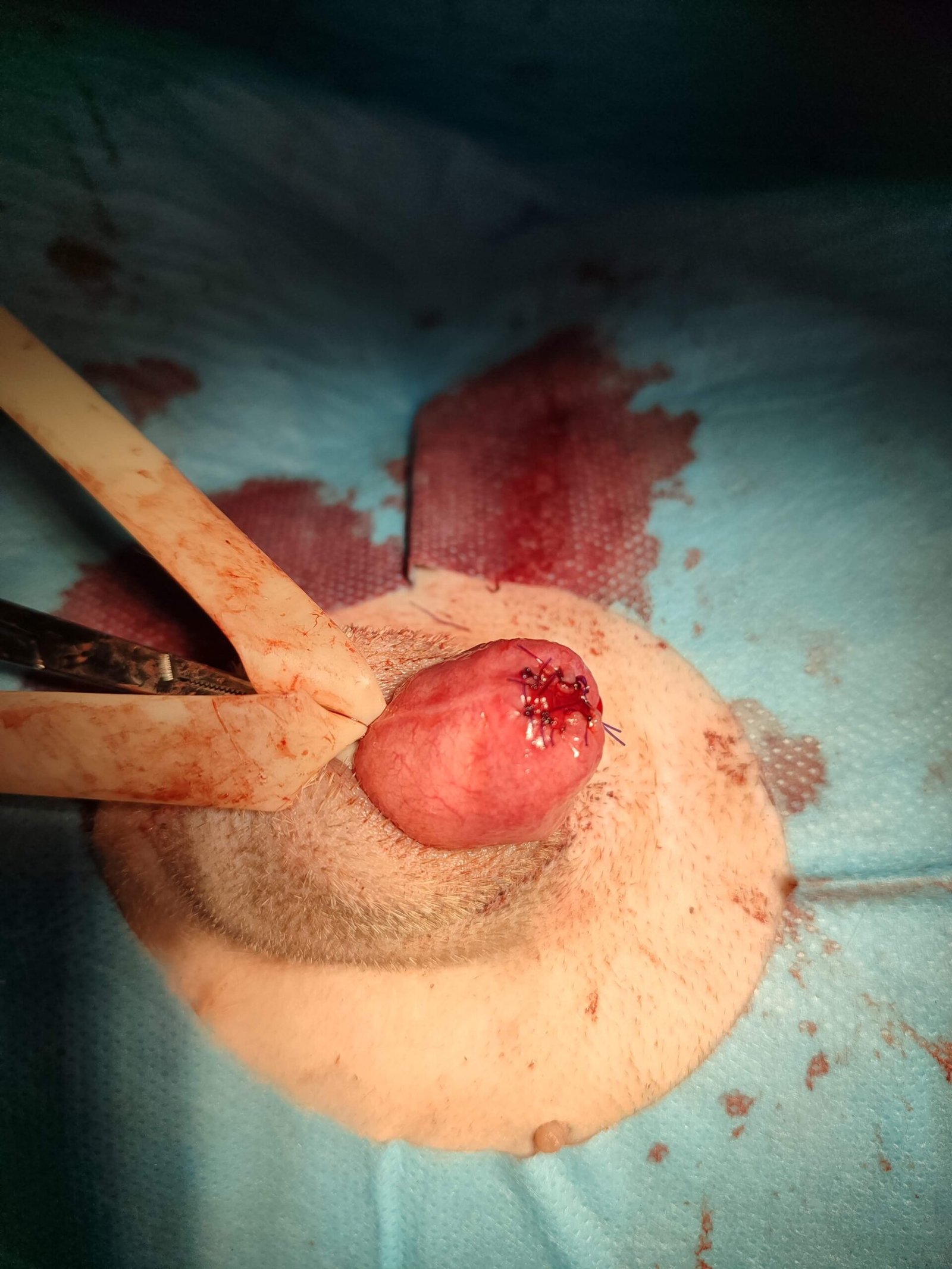El procedimiento realizado fue una uretrostomía, técnica quirúrgica que permite crear una nueva abertura en la uretra para mejorar el flujo urinario y evitar futuras recurrencias del prolapso. Se llevó a cabo bajo anestesia general, asegurando la máxima precisión y seguridad para el paciente. La intervención fue exitosa, logrando corregir la afección sin complicaciones y reduciendo significativamente el riesgo de nuevos episodios.